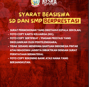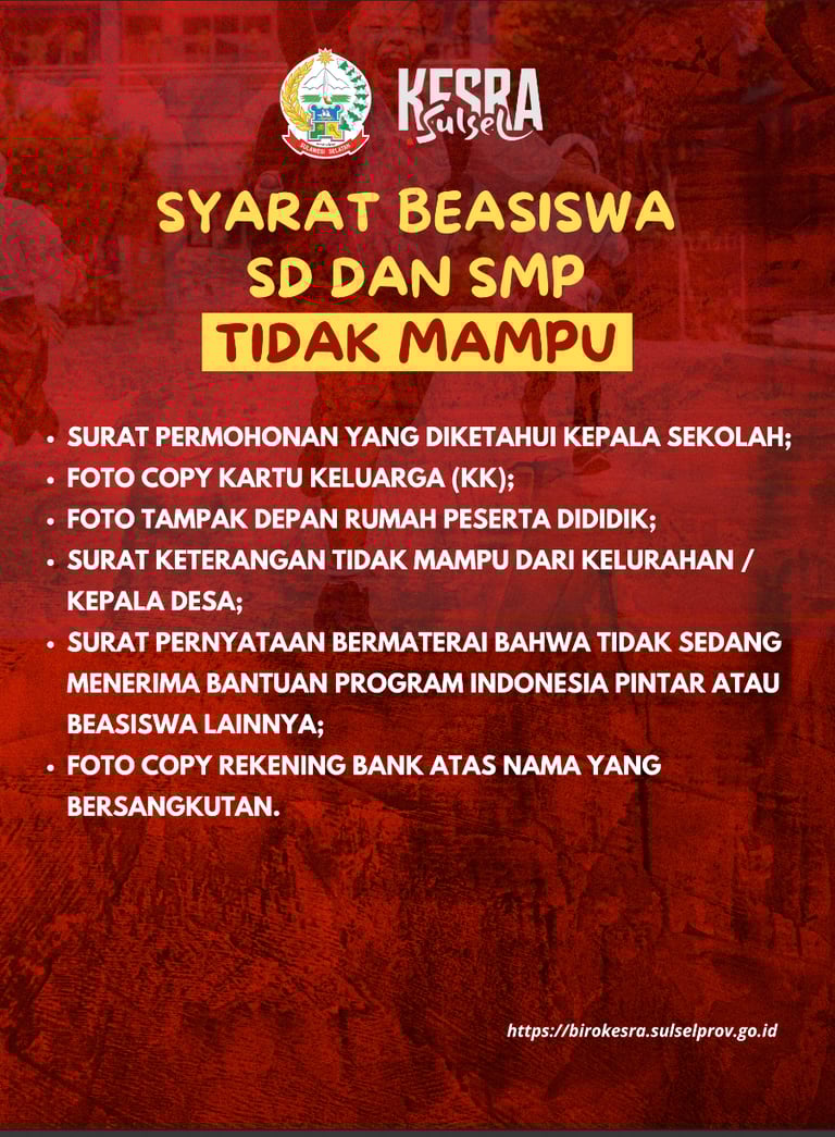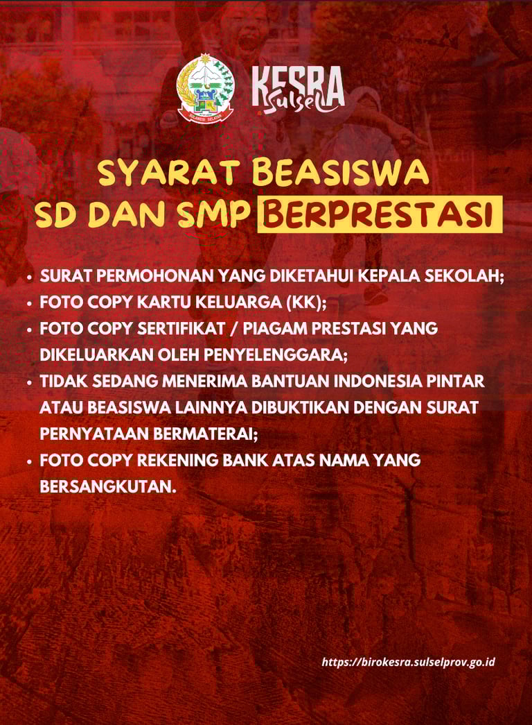 Pemerintah Provinsi Sulawesi Selatan menyediakan beasiswa untuk siswa sekolah dasar yang berprestasi, dengan persyaratan sebagai berikut :