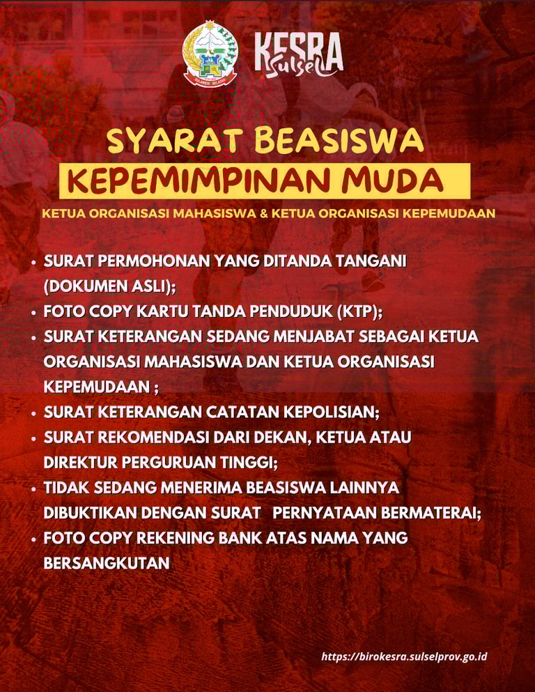 Pemerintah Provinsi Sulawesi Selatan menyediakan beasiswa untuk Ketua Organisasi Mahasiswa & Ketua Organisasi Kepemudaan, dengan persyaratan sebagai berikut :